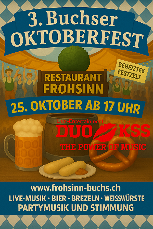 Es ist wider Oktoberfestzeit. Zum dritten mal Organisieren wir vom Frohsinn das Buchser Oktoberfest. Im beheizten Festzelt mit der Live Musik: DUO KISS.